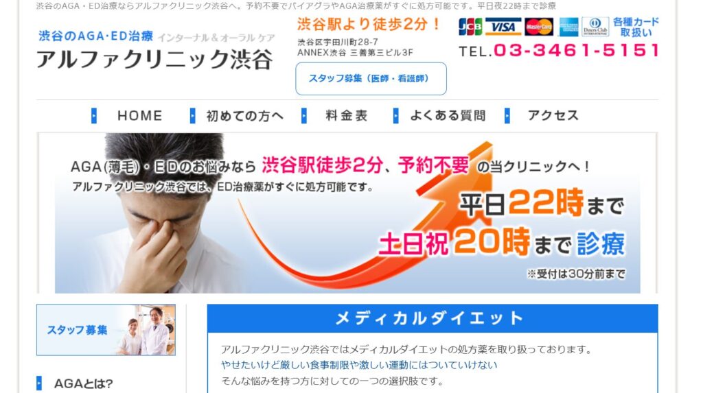 | 診療時間 | オンライン予約日時 7:00~23:30 渋谷院 10:30~14:00/15:30~20:00(平日)9:00~13:00/14:00~18:00(土日祝)※院によって異なる |