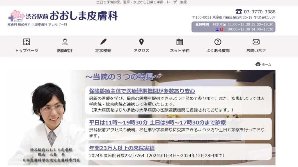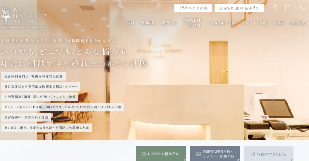 | 診療時間 | オンライン予約日時 7:00~23:30 渋谷院 10:30~14:00/15:30~20:00(平日)9:00~13:00/14:00~18:00(土日祝)※院によって異なる |